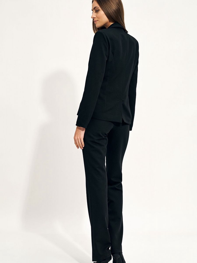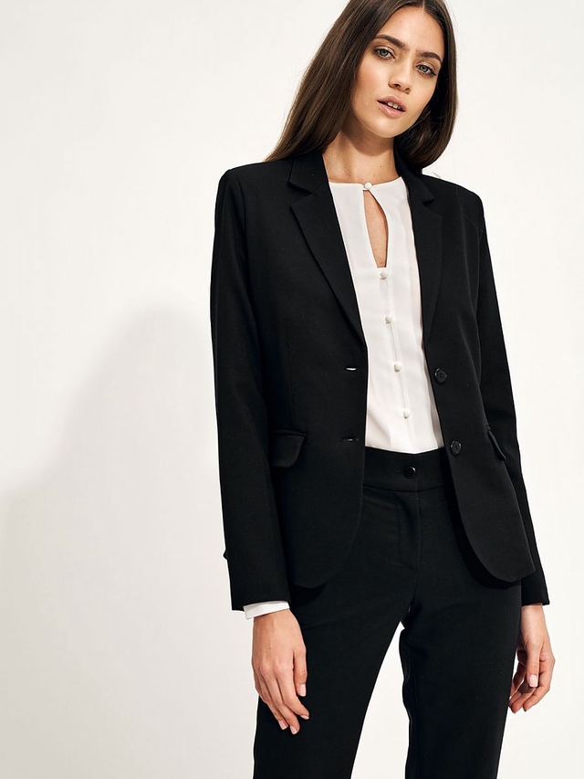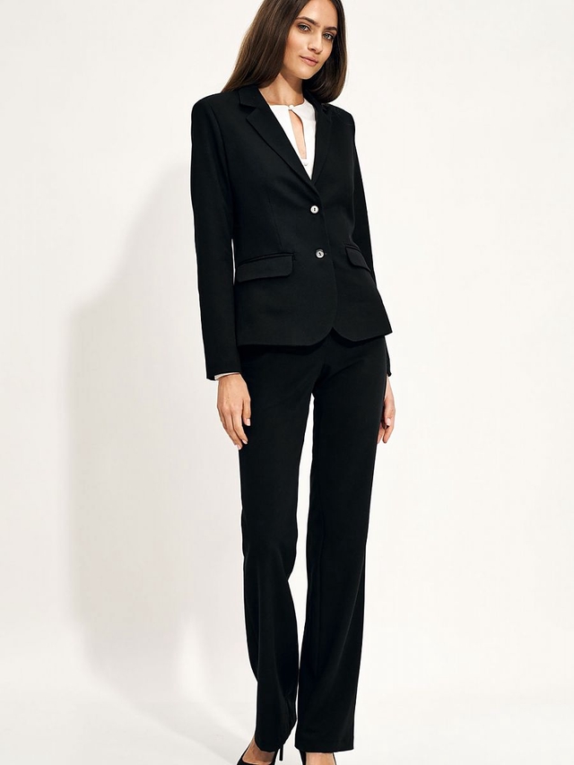Un blazer classico dal taglio casual, necessario per il vostro stile non solo per il lavoro ma anche per l'abbigliamento di tutti i giorni. Potete abbinarlo con successo a jeans, pantaloni da tailleur o a un abito da sera. La giacca è molto aderente in vita e ha una chiusura frontale a due bottoni. Insieme ai pantaloni svasati, crea un elegante set da ufficio.