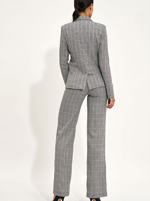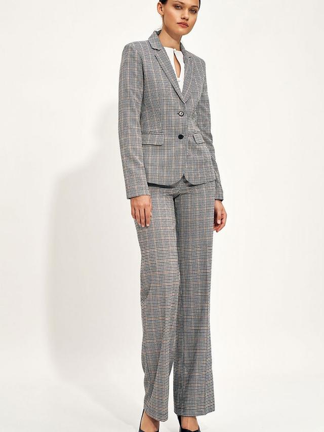 Un blazer classico dal taglio casual, necessario per il vostro stile non solo per il lavoro ma anche per l'abbigliamento di tutti i giorni. Potete abbinarlo con successo ai jeans, ai pantaloni della tuta o a un abito da sera. La giacca è molto aderente in vita e ha una chiusura frontale a due bottoni. Insieme ai pantaloni svasati, crea un elegante set da ufficio.