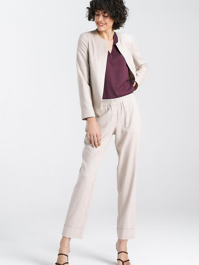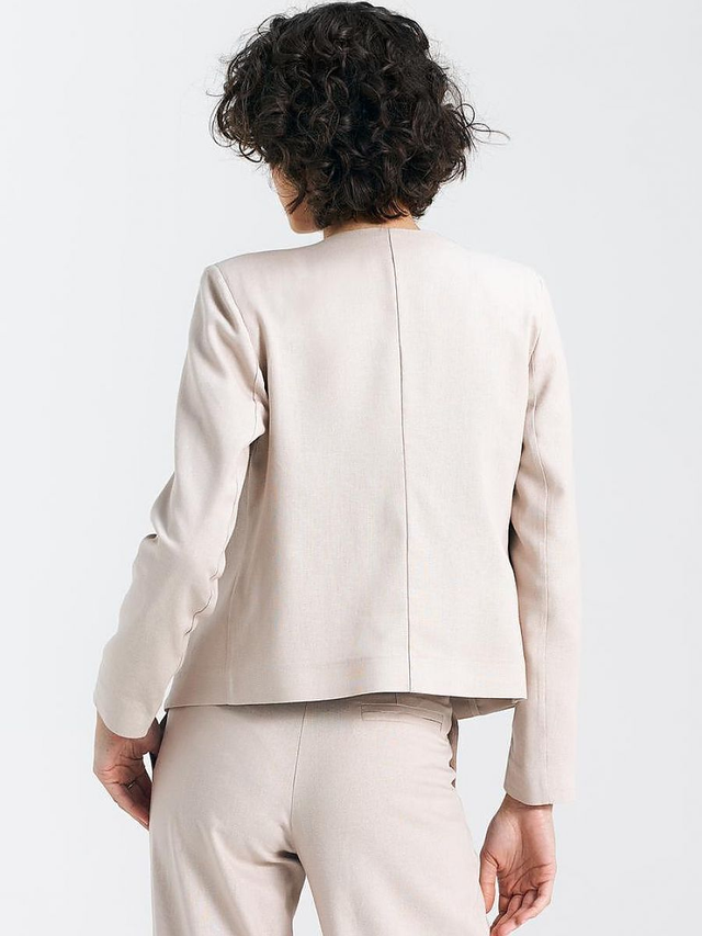 La giacca dal taglio regolare colpisce per la sua eleganza e il suo stile unico. La sua forma corta e squadrata enfatizza la silhouette aggiungendo sottigliezza e raffinatezza a qualsiasi stile. Realizzata in un tessuto di alta qualità che comprende viscosa, lino e cotone, garantisce non solo un look eccellente ma anche un abbigliamento confortevole. Il colore di questa giacca unica è il beige, che può essere abbinato a molti stili. Questa giacca non ha una chiusura tradizionale, il che le conferisce un aspetto moderno e leggero. Le spalline aggiungono struttura ed eleganza, accentuando delicatamente la silhouette. Inoltre, la giacca è dotata di una fodera che assicura non solo comfort, ma anche durata e solidità. È la scelta ideale per chi apprezza uno stile sofisticato e originale e una lavorazione di alta qualità.