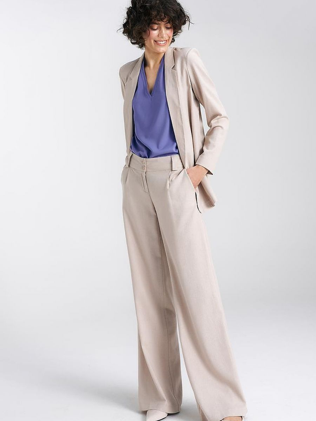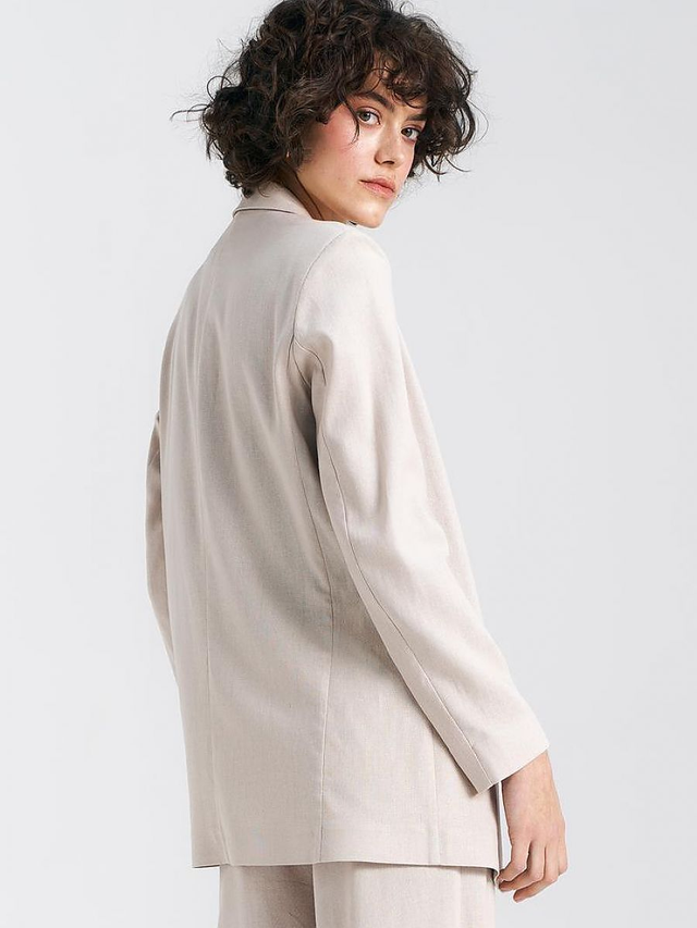 La giacca da donna con vestibilità regolare e ampia è la scelta perfetta per le donne che apprezzano un abbigliamento casual e confortevole. Realizzata in un tessuto di alta qualità che comprende viscosa, lino e cotone, offre comfort e una piacevole sensazione sulla pelle. Si caratterizza per i suoi revers foderati, che gli conferiscono un tocco sofisticato. Senza chiusura, è un capo comodo e chic, ideale sia per gli outfit formali che per quelli più casual. Le spalline aggiungono struttura e delicatezza alla silhouette, creando un look armonioso. Questa giacca è sfoderata, quindi leggera e ideale per le giornate più calde. Le cuciture interne sono accuratamente bordate, evidenziando l'alta qualità della lavorazione e l'attenzione ai dettagli. È una scelta eccellente per le donne che apprezzano sia l'eleganza che il comfort nell'abbigliamento quotidiano.