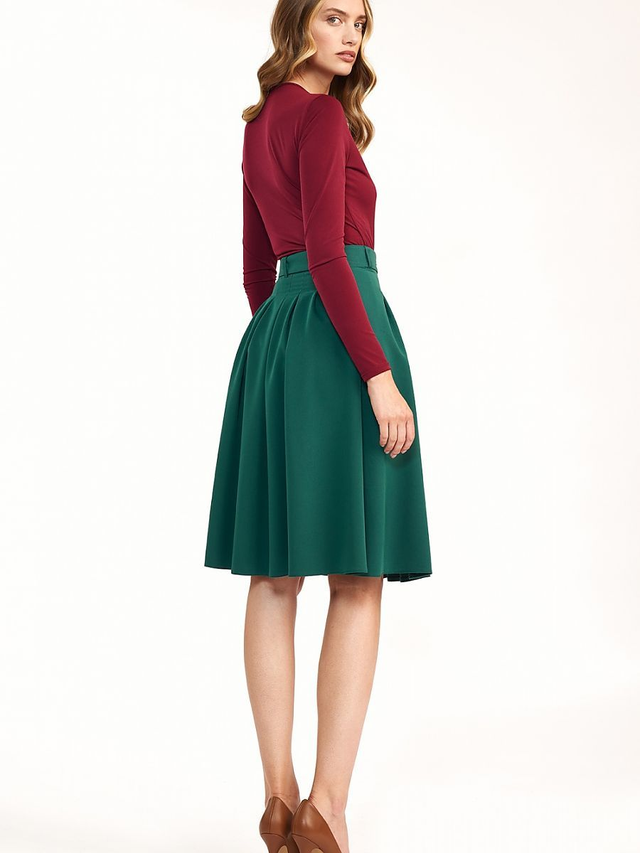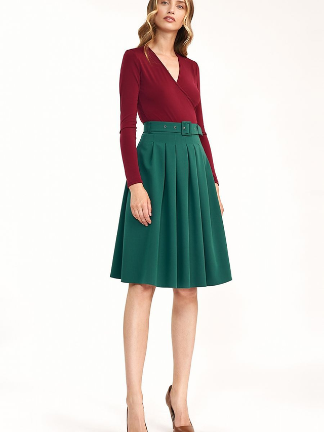 Questo modello di gonna enfatizza perfettamente tutte le risorse della figura. La sua lunghezza conservativa e il taglio A-line completeranno gli abiti da ufficio. La cintura e le pieghe aggiungono finezza e danno alla gonna un carattere del tutto nuovo. Questo taglio è senza tempo e puoi usarlo per molte occasioni!