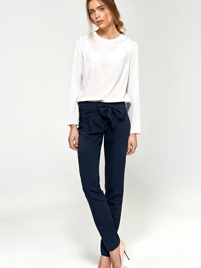 Classica camicetta a maniche lunghe aggiornata con drappeggio asimmetrico. Il modello ha una scollatura rotonda incorporata e maniche lunghe. La camicetta si chiude con un bottone sul retro.