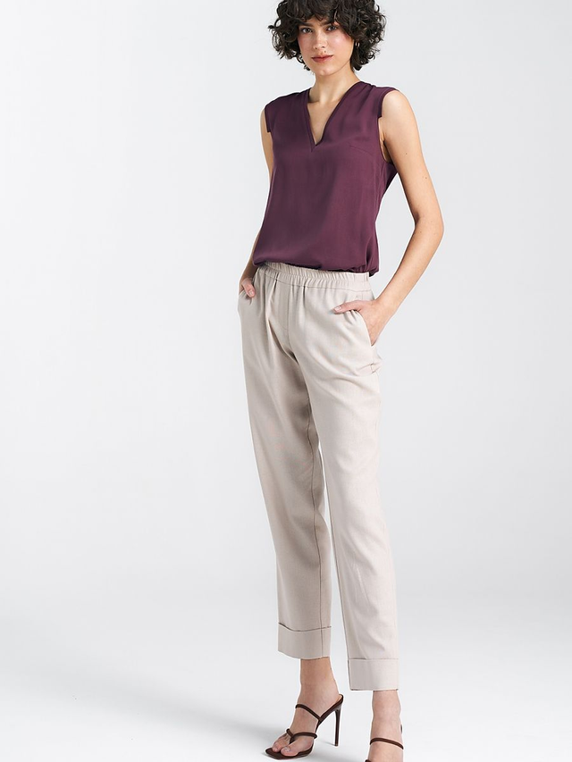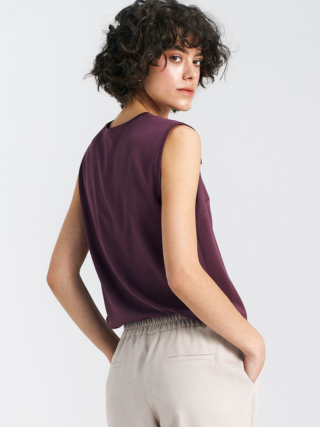 La camicetta dal taglio regolare colpisce per la sua semplicità ed eleganza. È realizzata in un piacevole tessuto di viscosa che garantisce comfort e libertà di movimento. La profonda ma sottile scollatura a V conferisce un tocco sofisticato all'insieme. Questo top senza maniche è la scelta perfetta per le giornate calde e aggiunge leggerezza e freschezza a qualsiasi outfit. La finitura estremamente femminile ed elegante delle spalle e della scollatura, sotto forma di una delicata piega, conferisce alla camicetta un fascino sottile e un carattere unico. Il colore prugna, noto anche come pozione viola, conferisce alla blusa una straordinaria profondità e un'espressione unica e alla moda. È la scelta perfetta per chi apprezza sia il classico che un tocco di stravaganza. Questa blusa, infilata sopra la testa, sarà l'aggiunta perfetta al vostro guardaroba, aggiungendo uno stile unico a qualsiasi outfit femminile.