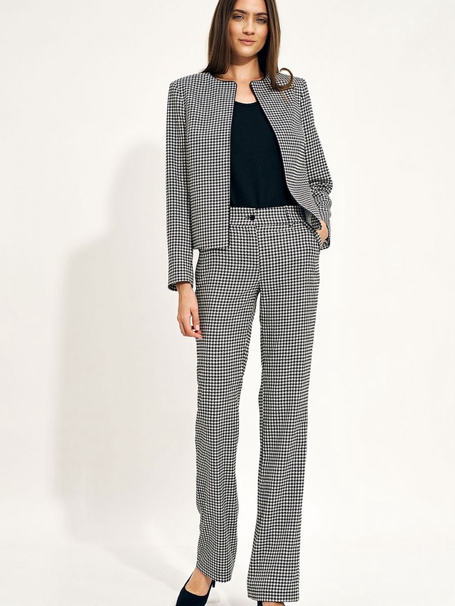 Pantaloni classici svasati. I classici vengono spezzati con la stampa pepite più alla moda di questa stagione. La loro vita alta con un pannello cucito sembra una cintura larga. I pantaloni hanno gambe svasate e una vestibilità sartoriale, grazie alla quale sottolineano la figura e saranno perfetti con scarpe con tacco o plateau. Insieme a un blazer della stessa fantasia, crea un elegante set in stile softoffice.