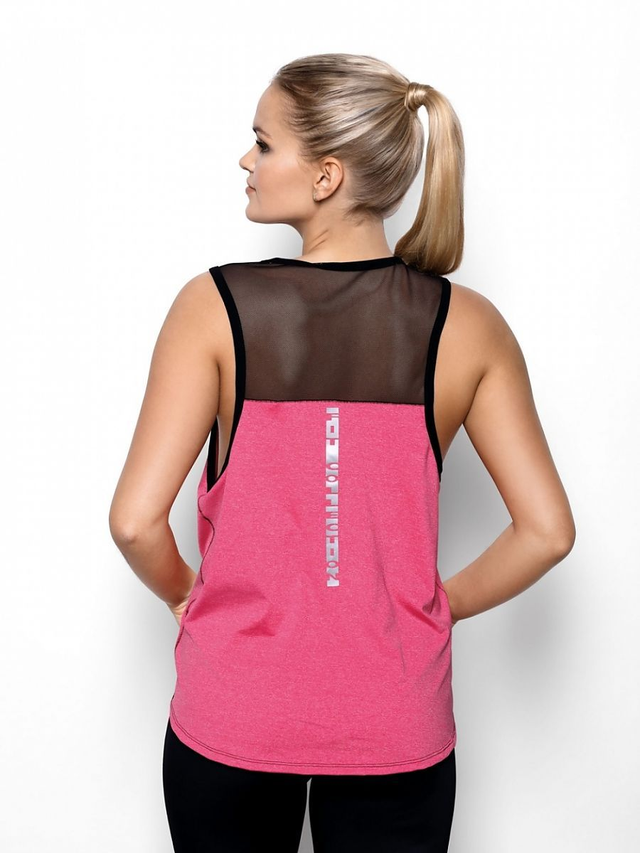 Interessante camicetta della collezione Fit di Eldar. con un inserto trasparente (rete. tulle nero) posto sia sulla schiena che intorno alle spalline. Tagliato con tagli più profondi sotto le braccia. funzionerà anche come complemento a un top sportivo. Grande colore femminile.