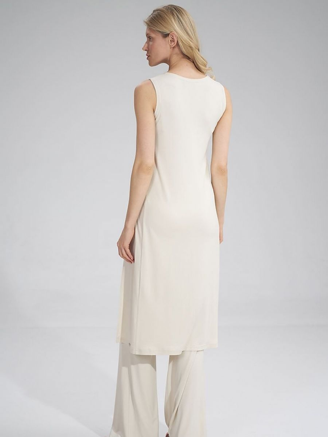 Tunica midi estiva. Senza maniche, senza tasche. Due spacchi decorativi sul davanti.
