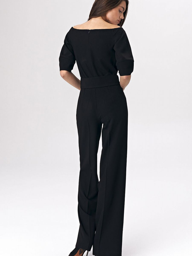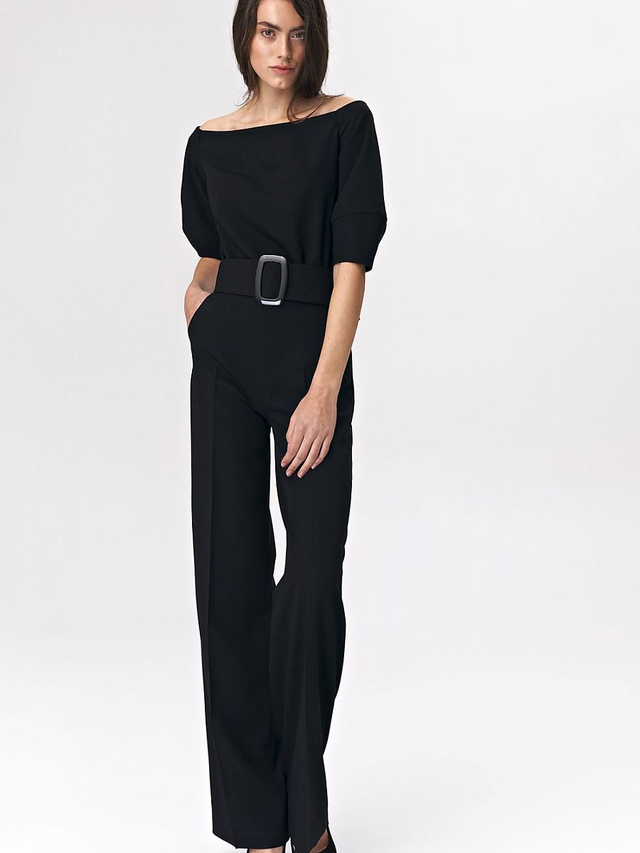 Il tailleur nero da donna è un'alternativa perfetta ai classici abiti da ufficio. Il sensuale taglio cold-shoulder espone splendidamente la linea delle spalle, mentre l'ampia cintura con una fibbia spettacolare accentua la vita. Il materiale piacevole al tatto con una miscela di viscosa assicura un elevato comfort di vestibilità.