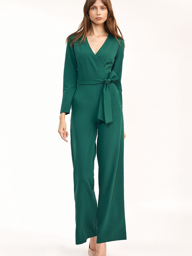 Tuta ultra femminile con scollatura a busta e cintura da annodare. Il modello si adatta perfettamente al corpo grazie al mix di materiali elastici e viscosa. Il vestito ha le gambe dritte.