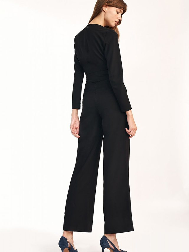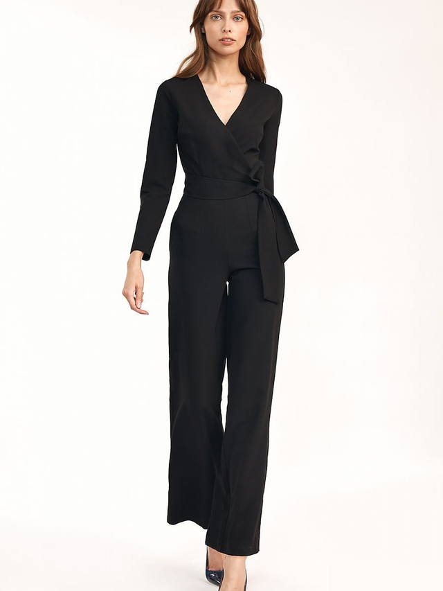 Tuta ultra femminile con scollatura a busta e cintura da annodare. Il modello si adatta perfettamente al corpo grazie al mix di materiali elastici e viscosa. Il vestito ha le gambe dritte.
