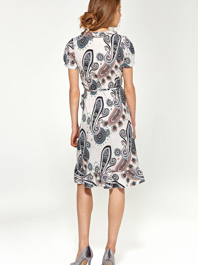 Un abito leggero e molto femminile con rouches asimmetriche è perfetto per le giornate calde e persino bollenti. L'abito ha un taglio a busta ed è legato con una cintura delicata in vita. Perfetto per l'estate! Il vestito è sfoderato.