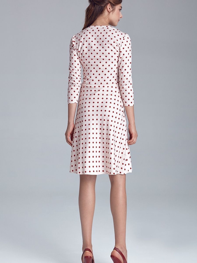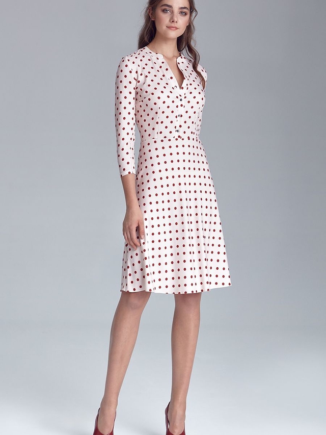 Vestito dal taglio dritto con chiusura frontale a bottoni. Il modello ha maniche a 3/4 ed è lungo fino al ginocchio. L'abito morbido in stile ufficio completa perfettamente il guardaroba autunnale e invernale dell'ufficio. L'abito è sfoderato, chiuso con bottoni a pressione e una zip sul lato.