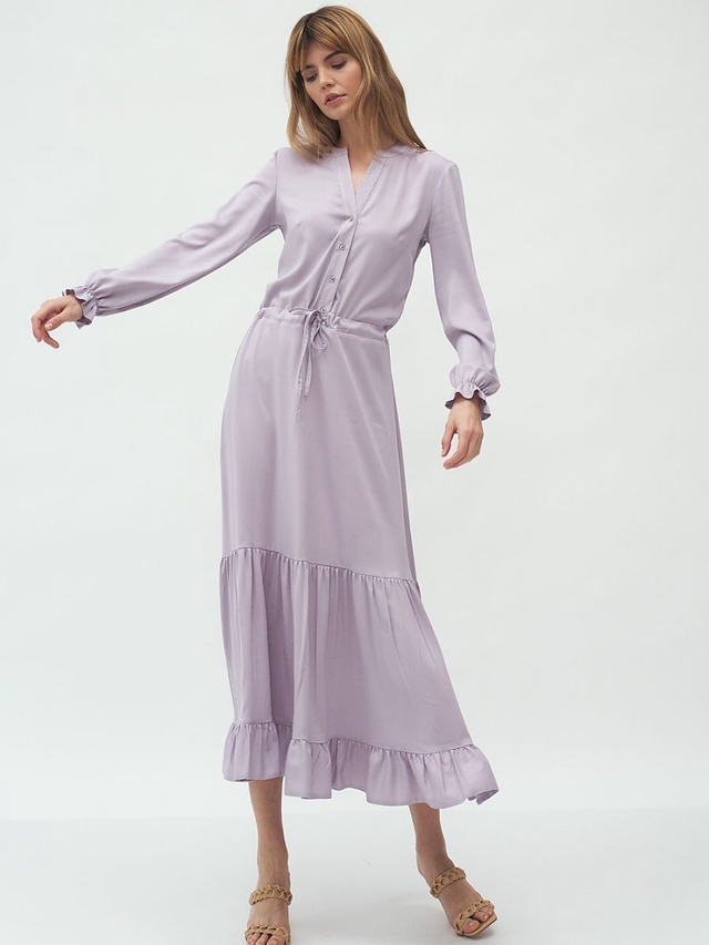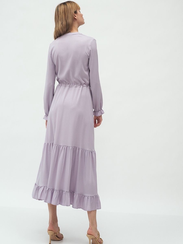 La nostra prossima proposta per un abito midi. Il vestito ha una cravatta che accentua perfettamente la vita. Un sottile orlo a balze sulle maniche e sul fondo del vestito lo fa sembrare leggero. Starà molto bene con scarpe pesanti, ma non solo. Indossalo con delle ballerine e un cardigan lungo, e sei pronto per un outfit casual! Il materiale ti terrà comodo tutto il giorno! Un modello che non può mancare nel tuo guardaroba.