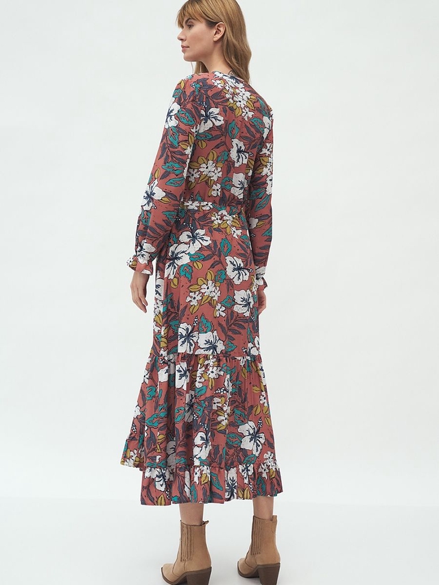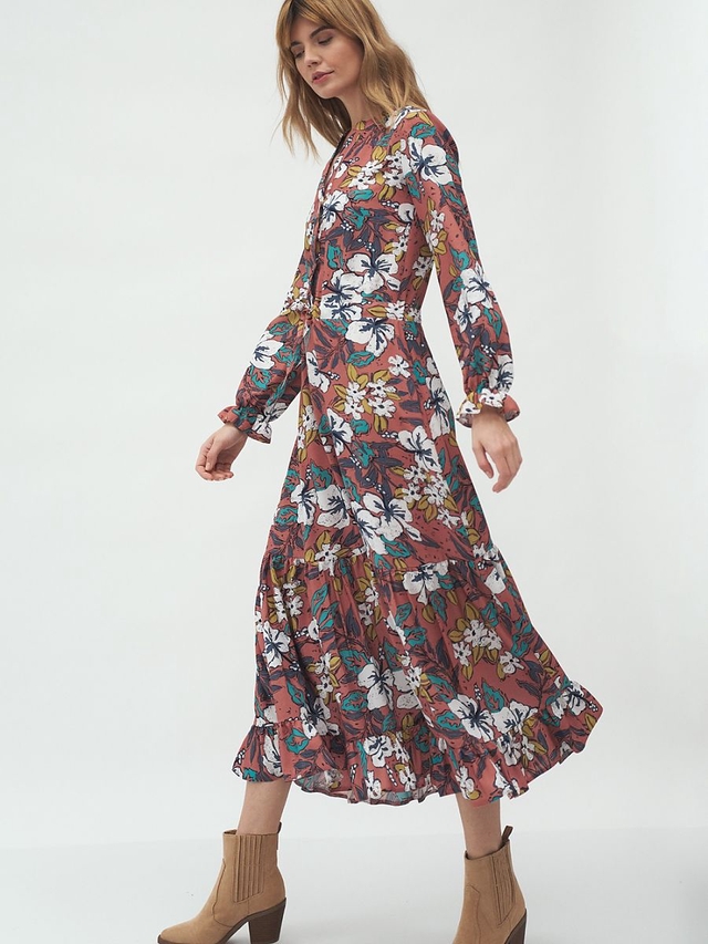 La nostra prossima proposta per un abito midi. Il vestito ha una cravatta che accentua perfettamente la vita. Un sottile orlo a balze sulle maniche e sul fondo del vestito lo fa sembrare leggero. Inoltre, un modello di pisello estremamente femminile è un modello che non può mancare nel tuo guardaroba. Il vestito starà benissimo con gli stivali pesanti, ma non solo. Indossalo con delle ballerine e un cardigan lungo, e lo styling per un incontro casual è pronto! Il materiale ti terrà comodo tutto il giorno!