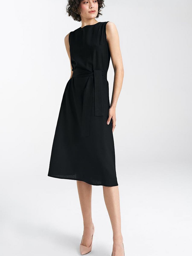 Un abito dal taglio regolare, realizzato in una miscela di viscosa, lino e cotone, che unisce perfettamente eleganza e comfort. Ha un collo rotondo ed è senza maniche, il che le conferisce leggerezza e un carattere estivo. La chiusura posteriore con cerniera nascosta garantisce una finitura estetica e facilità di indossamento. La lunghezza midi rende l'abito versatile e adatto a diverse occasioni. Nell'insieme è incluso un cinturino da legare che permette di evidenziare la vita. L'abito non ha una fodera interna, il che aumenta ulteriormente il comfort nelle giornate più calde.