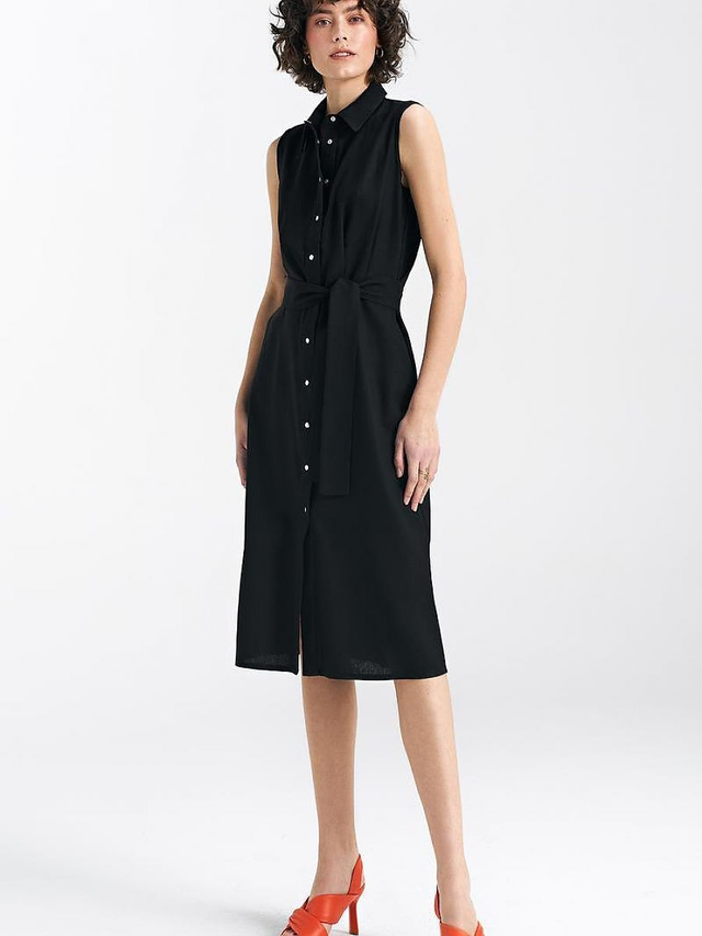 Un vestito di taglio regolare tipo camicia, realizzato in una miscela di viscosa, lino e cotone, è una perfetta combinazione di eleganza e comodità. Ha un classico collo e è senza maniche, che le conferiscono leggerezza e stile. La chiusura con bottoni d'argento aggiunge un tocco moderno e facilita l'indossare. La lunghezza midi rende il vestito perfetto per diverse occasioni, sia formali che casual. Le tasche classiche aggiungono funzionalità e la cintura inclusa consente di accentuare la vita. Il vestito non ha una fodera, il che aumenta il comfort durante le giornate più calde.